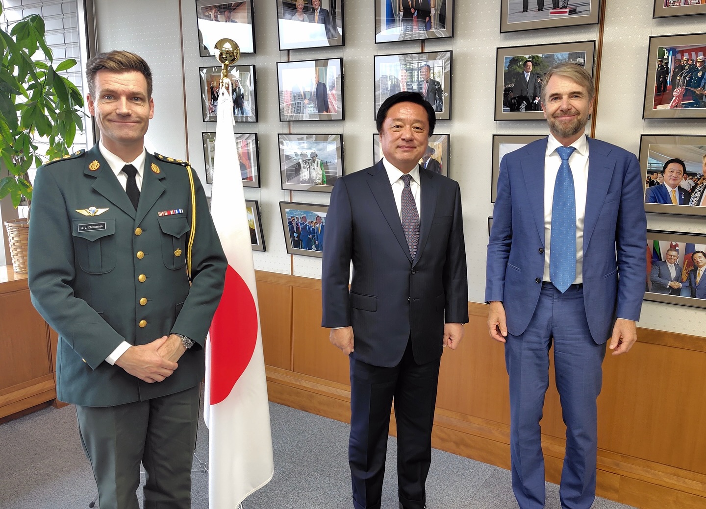 面会依頼を受け、防衛大臣補佐官室でフリース=マスン駐日デンマーク大使(写真右端)とクリステンセン駐在武官(写真左端)とお会いし、懇談しました。内容は、昨今の国際情勢と日本と デンマーク、日本と EU、日本と NATO(北