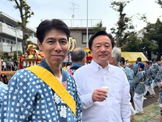 世田谷区新町にある久富稲荷神社にいます。お隣の坂口区議とご一緒しました。左後方に写っているのがお神輿です。大人神輿の他に子供神輿もあり、大変な盛り上がりです。