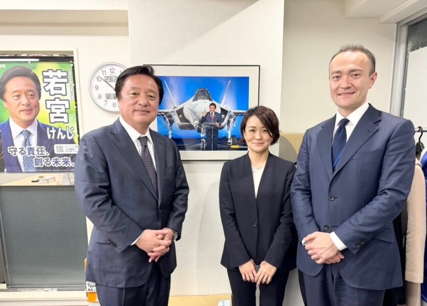 米国から訪日されたロッキード・マーティン社の二人が地元事務所にお見えになりました。お二人とは長いお付き合いで、後ろにある写真で私のバックにある戦闘機は、ロッキード・マーティン社が中心となった戦闘機 F35A の初号機です。2016年米テキサス州ダラスで行われたロールアウト式典の時のものです。