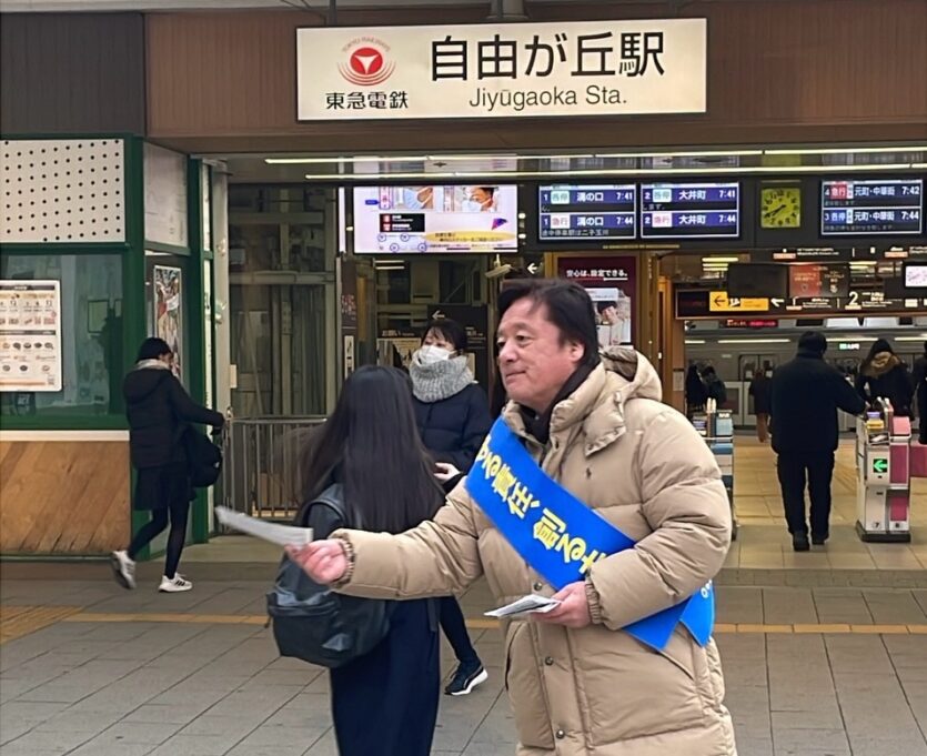 東急沿線の自由が丘駅にて朝の駅頭活動