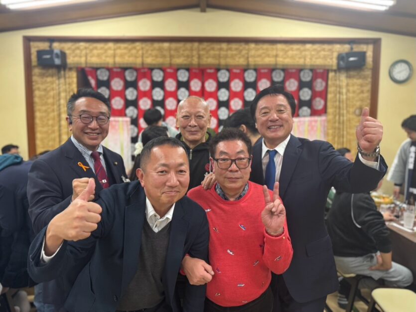 地元世田谷区の北澤八幡神社の新年会におじゃまし、皆様方にご挨拶です。こちらはお神輿の睦の会のメンバーとのご一緒の写真です。大いに盛り上がっています。後列左端は世田谷の畠山区議です。