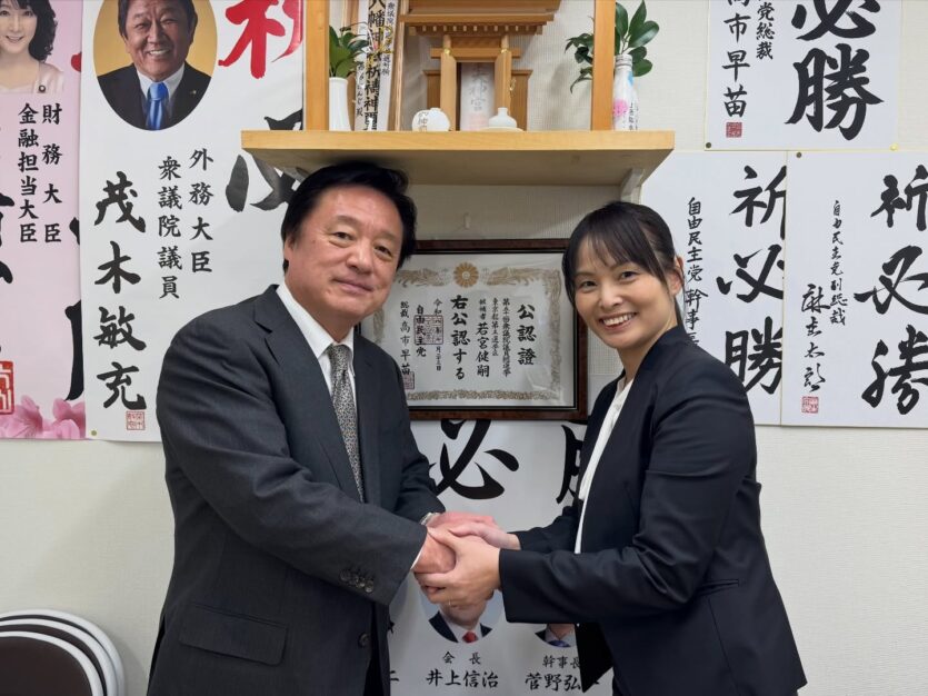 東京都比例区で自民党から立候補予定の森原きよこ氏が、事務所にご挨拶にお見えになりました。神棚をバックに固い握手。お互いに頑張りましょう!