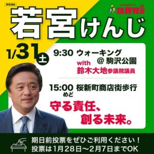 2026年 1月 20日 朝は、小田急線と京王井の頭線が乗り入れる下北沢駅前にて、世田谷区議団のメンバーと共に街頭活動を行いました。夜は、地元の上野毛稲荷神社と二子玉川商店街振興組合の新年会に出席し、挨拶をしました。